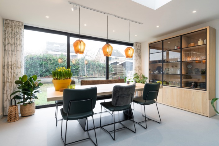 Naast de uitbouw is de volledige benedenverdieping aangepakt. “We wisten redelijk goed dat we een strakke, Scandinavische, stijl wilden”, legt Masja uit. “Inter Art heeft ons geholpen met tekeningen en kleurstellingen, waarna we samen het project hebben vormgegeven. Ze kwamen bijvoorbeeld met het idee om geen kookeiland te plaatsen, maar juist een kastenwand aan de zijkant. Dat heeft ervoor gezorgd dat het veel ruimtelijker aanvoelt.” De kastenwand heeft een prachtige symmetrie met handige opbergvakken waardoor het een speelse look krijgt.