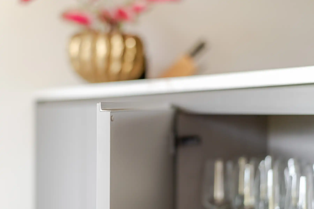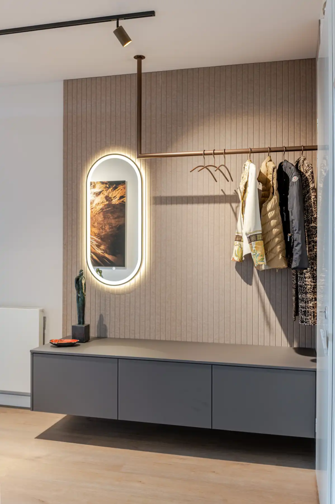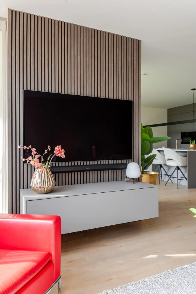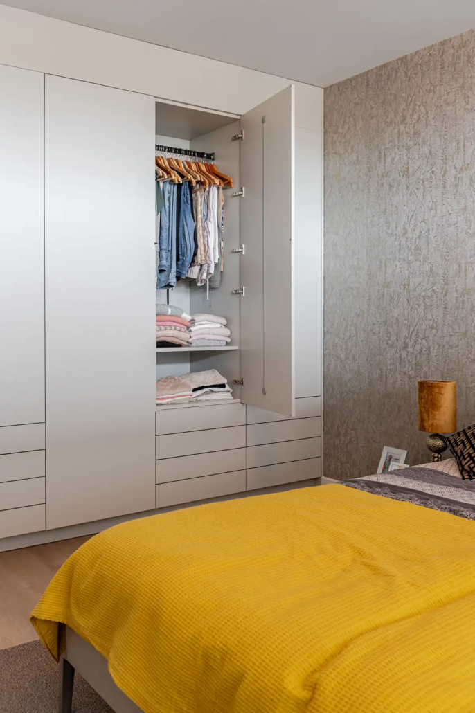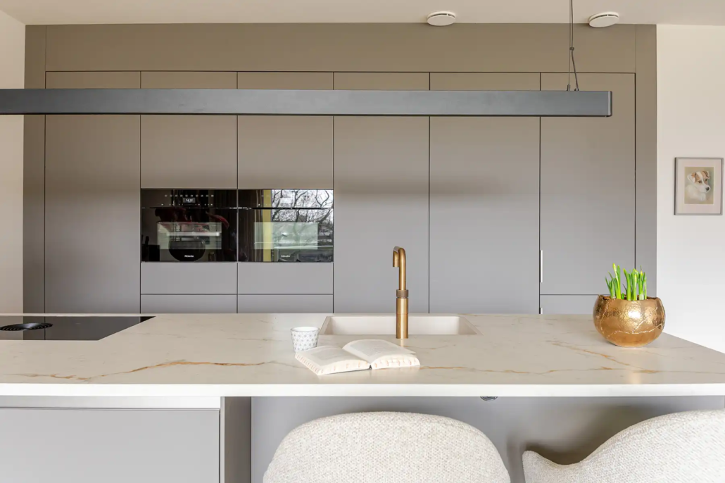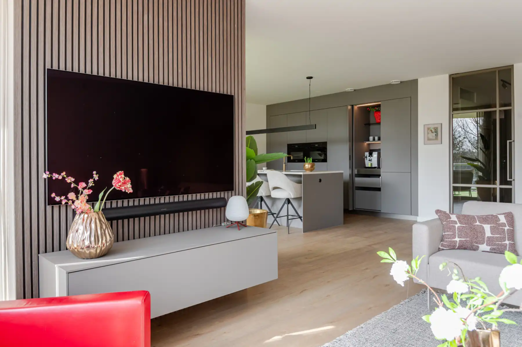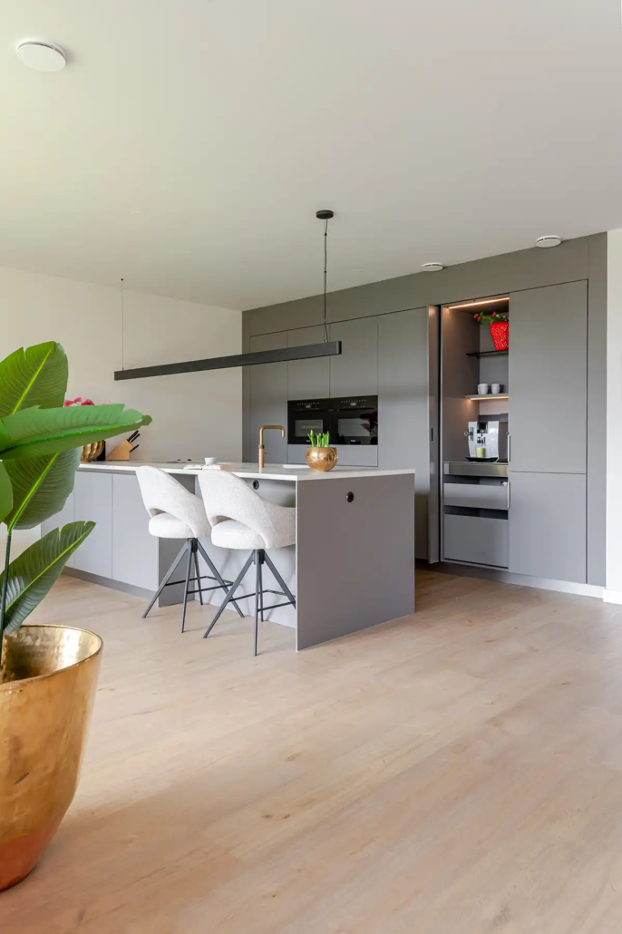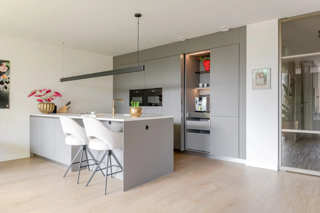 Naast de keuken en badkamer kozen Henkjan en Marriëtte ook voor maatwerk meubels. “We wilden geen standaard kasten, maar iets dat echt bij het appartement paste”, zegt Henkjan. “Gerhard heeft ons geholpen om creatieve oplossingen te bedenken voor de garderobe en de tv-wand. Het resultaat is precies zoals we het in gedachten hadden. We hebben ook gekozen voor maatwerk kasten in de slaapkamer en bijkeuken, die tot aan het plafond reiken.”