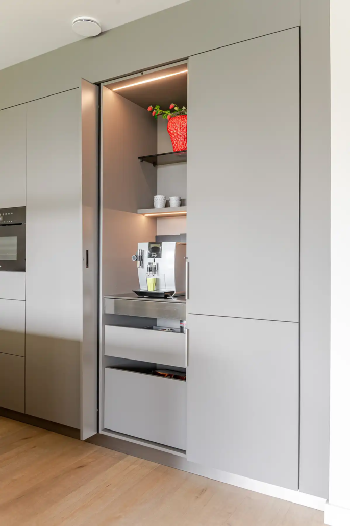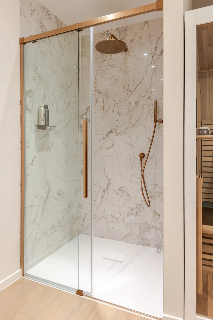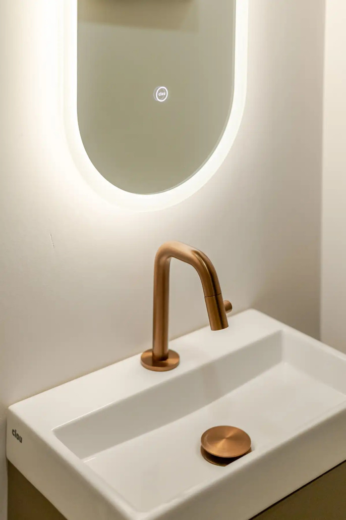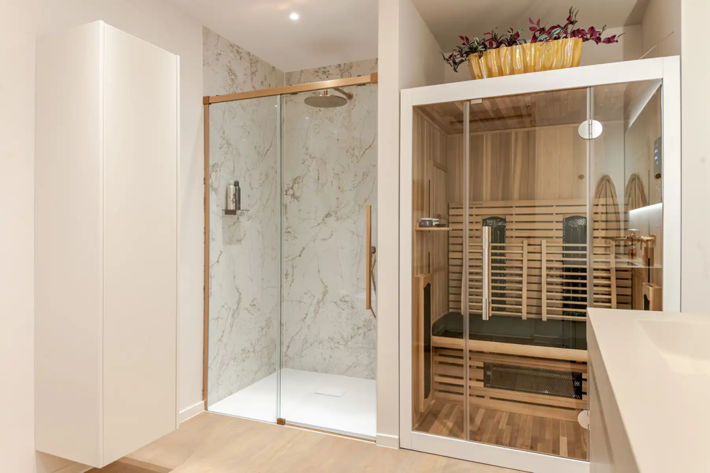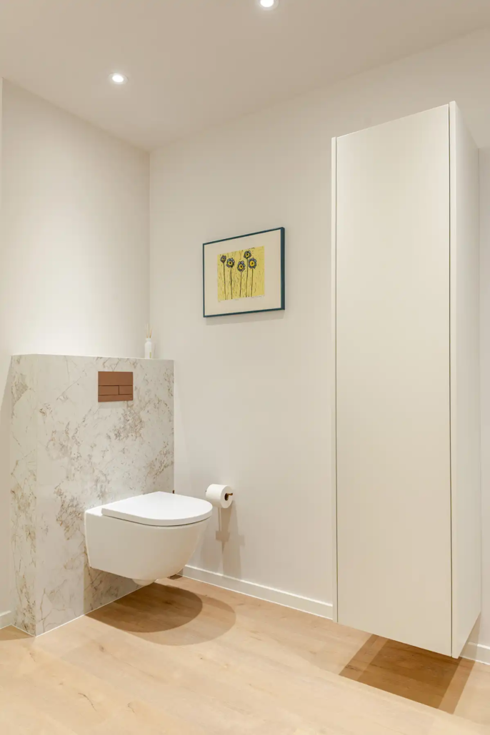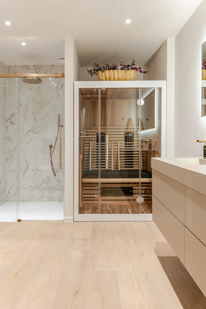 De keuken was natuurlijk een belangrijk onderdeel van de verbouwing, maar Henkjan en Marriëtte wilden dat ook de rest van het appartement dezelfde zorgvuldigheid zou uitstralen. “We wilden niet alleen een mooie keuken, maar ook een badkamer, toilet en garderobekasten die perfect bij de rest van het huis zouden passen”, vertelt Henkjan. De badkamer kreeg bijvoorbeeld een infraroodsauna, een wens van Henkjan zelf. “We hebben samen met Gerhard de juiste afmetingen bepaald en alles werd keurig geplaatst en gemonteerd.”