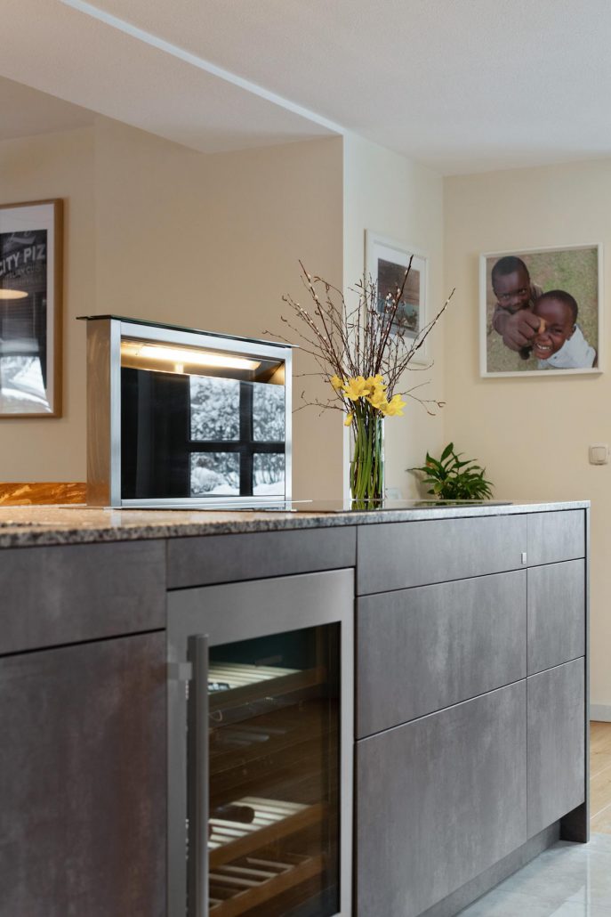 De keuken van Carmen en haar man Angel valt bij hen uitstekend in de smaak. ‘Hij is modern en ruim, maar met een warme uitstraling. Heel mooi! Als we gasten krijgen, lopen ze meestal meteen door naar de keuken. Daar zitten we dan gezellig aan de bar of aan de eettafel.’ Met name Angel houdt van kokkerellen: behalve Spaans ook Italiaans, Mexicaans en Indonesisch. ‘Ik hou van het eten zelf’, lacht Carmen. Bij het koken maken beiden graag gebruik van de inductiekookplaat met geïntegreerd afzuigsysteem, de stoomoven en warmhoudlade. Ook de wijnklimaatkast en ijsklontjesmachine zijn een uitkomst. ‘We drinken graag (fris)dranken met ijsklontjes.’