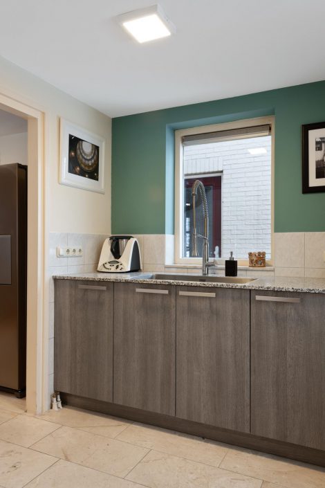 De bijkeuken, badkamer en het toilet zijn eveneens door Inter Art onder handen genomen. ‘Het fijne van de bijkeuken is dat alles netjes is weggewerkt. Zo zit de wasmachine achter de deurtjes’, zegt Carmen. ‘In het gastentoilet hebben we bewust ruimte gemaakt voor een grotere wasbak, omdat we het belangrijk vinden dat je je even kunt wassen. De achterwand van het toilet is mooi betegeld met patroontegels.’ Ook in de badkamer zijn uitgesproken patroontegels te vinden, die perfect combineren met het witzwarte bad. ‘Kortom, we zijn erg blij met onze keuken, bijkeuken, toilet en badkamer. Het is elke dag thuiskomen!’